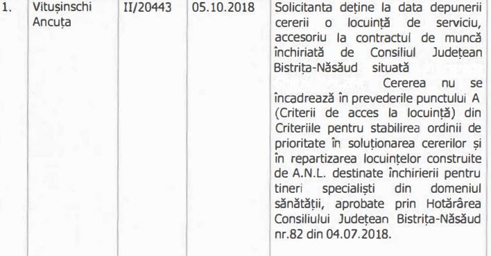 Astfel, pe lista aprobată cu 27 de voturi pentru figurează mai mulți medici care lucrează în cadrul Spitalului Județean de Urgență Bistrița și care au depus dosare pentru acordarea unor astfel de locuințe. În total au fost depuse 21 de dosare, dintre acestea unul singur fiind respins, întrucât persoana care a făcut solicitarea mai deține în chirie un apartament proprietate a Statului Român.Astfel, printre cei care vor primi în curând cheile unor locuințe ANL se numără: