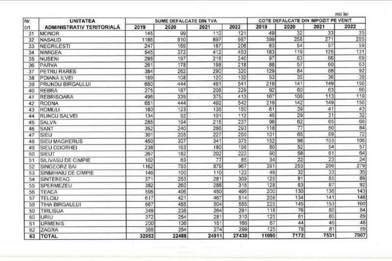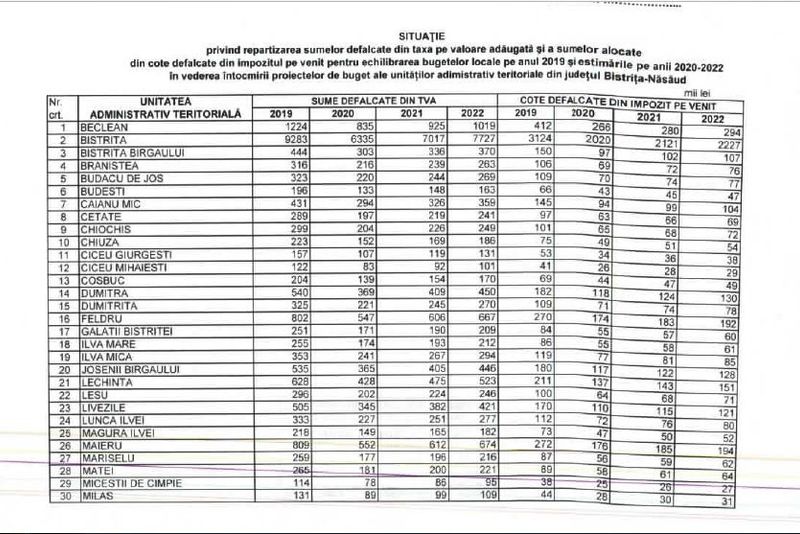 Consiliul Județean Bistrița-Năsăud a aprobat, miercuri, repartizarea sumelor defalcate din taxa pe valoare adăugată şi a sumelor alocate din cote defalcate din impozitul pe venit, pentru echilibrarea bugetelor locale pe anul 2019 şi estimările pe anii 2020-2022, în vederea întocmirii proiectelor de buget ale unităţilor administrativ-teritoriale bistrițene.