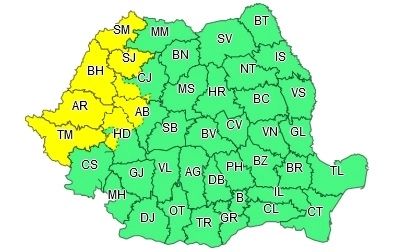 În intervalul menționat în vestul și nord-vestul țării, precum și în zona Munților Apuseni, vor fi perioade cu instabilitate atmosferică accentuată ce se va manifesta prin frecvente descărcări electrice, intensificări ale vântului și vijelii (viteze la rafală de peste 55...75 km/h), averse torenţiale și izolat grindină. Cantitățile de apă vor depăși 20...35 l/mp.