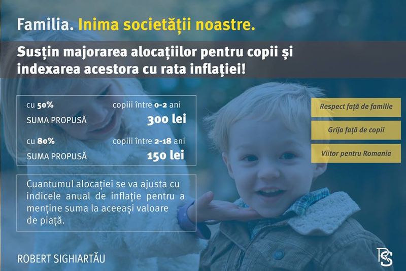 Pentru a repara acest neajuns, Robert Sighiartău a anunțat că a depus o propunere legislativă care vizează majorarea cu cel puțin 50% a alocațiilor pentru copii, și care să fie indexate anual cu rata inflației."