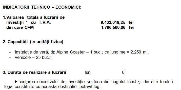 ”Având în vedere nevoia de dezvoltare şi de creştere a atractivităţii Complexului Sportiv Polivalent Unirea, se propune realizarea unei investiţii cu caracter recreativ, respectiv o instalaţie de vară tip Alpine Coaster, care constă din realizarea unui traseu de circa 2.250 m de şine metalice pe care se vor deplasa vehicole susţinute şi dirijate pe acest traseu”