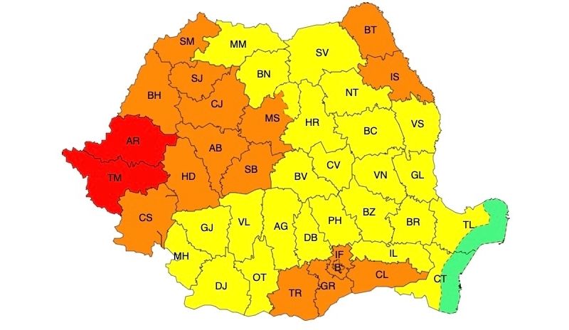 În județele Timiș și Arad valul de căldură va persista pentru a șaptea zi consecutiv. Temperaturile maxime vor fi în general de 38...39 de grade. Va fi caniculă și disconfort termic deosebit de accentuat, iar indicele temperatură-umezeală (ITU) va depăși pragul critic de 80 de unități. Minimele, de 19...25 de grade, local vor caracteriza o noapte tropicală.