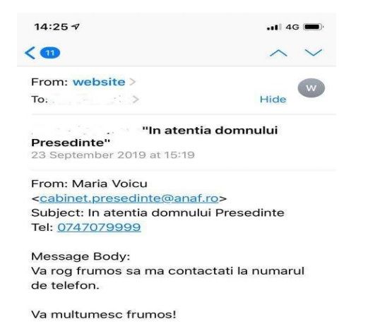 ”ANAF atenționează contribuabilii cu privire la e-mailuri false transmise în numele Cabinetului președintelui ANAF. Precizăm că, nu există vreo persoană cu numele Maria Voicu care să-și desfășoare activitatea la Cabinetul Președintelui. Pentru siguranța dumneavoastră, vă sfătuim să nu deschideți aceste emailuri, iar dacă au fost deschise, să nu urmați pașii descriși în acestea: să nu apelați numărul detelefon afișat/recomandat sau să dați Reply la email”, se arată într-un comunicat de presă al instituției.