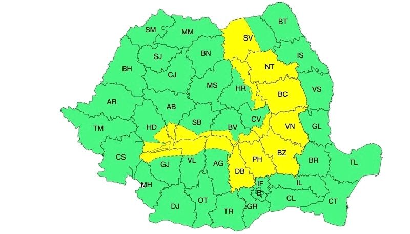 ANM a emis atenționări de tip Cod Galben pentru mai multe zone ale țării, vizând două fenomene meteo extreme