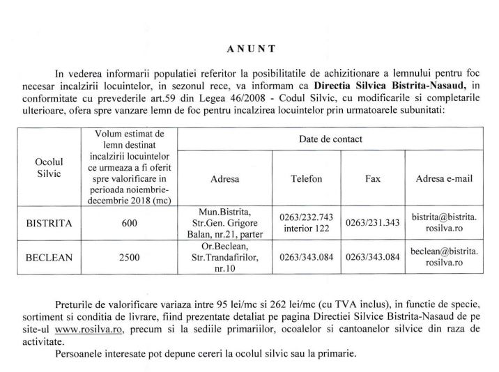 Două ocoale silvice din județul Bistrița-Năsăud, Bistrița, respectiv, Beclean, pun la dispoziția populației o cantitate de 3.100 de metri cub de lemn de foc. Preţurile de valorificare variază între 95 lei/mc şi 262 lei/mc (cu TVA inclus), în funcţie de specie, sortiment şi conditia de livrare.