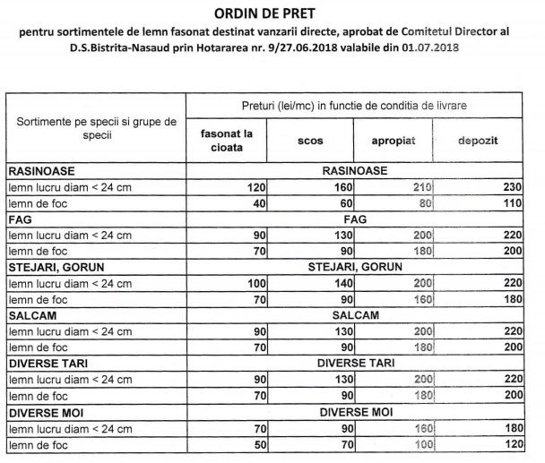 Preţurile de valorificare variază între 95 lei/mc şi 262 lei/mc (cu TVA inclus), în funcţie de specie, sortiment şi conditia de livrare, toate acestea fiind prezentate detaliat pe pagina Direcţiei Silvice Bistriţa-Năsăud, precum şi la sediile primăriilor, ocoalelor şi cantoanelor silvice din raza de activitate.