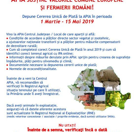 Agenția de Plăți și Intervenție pentru Agricultură Bistrița-Năsăud va da startul unei campanii de informare a fermierilor privind cererea unică de plată, aferentă anului 2019. Campania se va derula în toate localitățile din județ, sub sloganul “APIA susține valorile comunei europene și fermierii români!”.