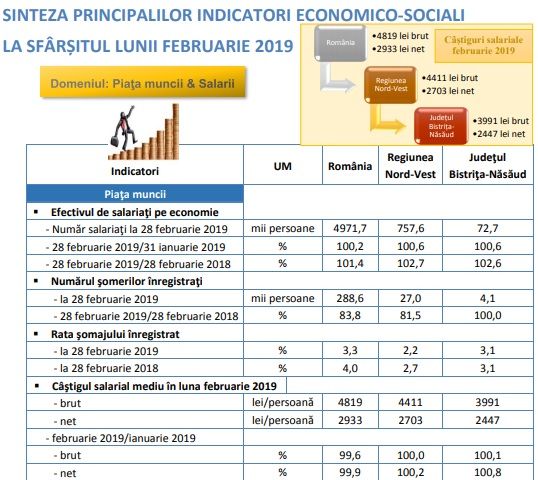 ”Câştigul salarial mediu înregistrat în judeţul Bistriţa-Năsăud a crescut în februarie 2019, faţă de luna precedentă, cu 0,1% la brut şi cu 0,8% la net”