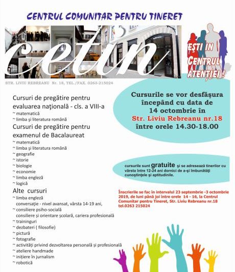Înscrierea la cursuri se face până la data de 3 octombrie, de luni până joi între orele 14.00 – 16.00, la sediul din strada Liviu Rebreanu nr. 18, telefon 0236-215 024.De asemenea, tinerii pot să se înscrie în echipa de voluntari a Centrului Comunitar pentru Tineret Bistriţa pentru acţiunile ce se desfăşoară pe tot parcursul anului în domeniile protecţia mediului, educaţie non formală şi diverse training-uri.Cursurile vor începe în data de 14 octombrie şi se vor desfăşura în imobilul reabilitat, modernizat şi dotat de primărie, situat pe strada Liviu Rebreanu nr. 18, patru zile pe săptămână - de luni până joi - între orele 14.30 – 18.00.În anul şcolar 2019-2020, oferta de cursuri este următoarea: