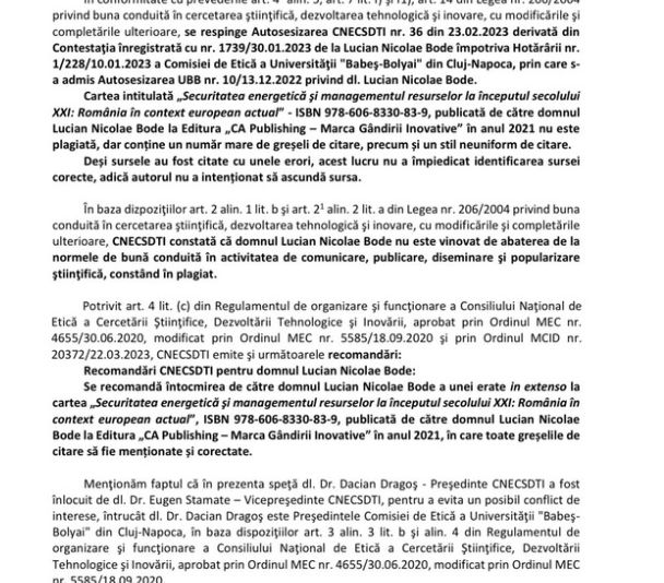 CNECSDTI constată că domnul Lucian Nicolae Bode nu este vinovat de abaterea de la normele de bună conduită în activitatea de comunicare, publicare, diseminare şi popularizare ştiinţifică, constând în plagiat."