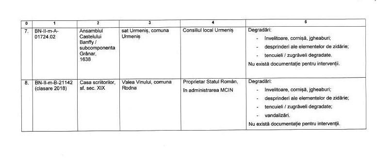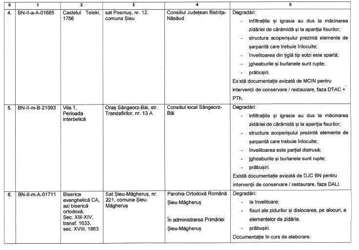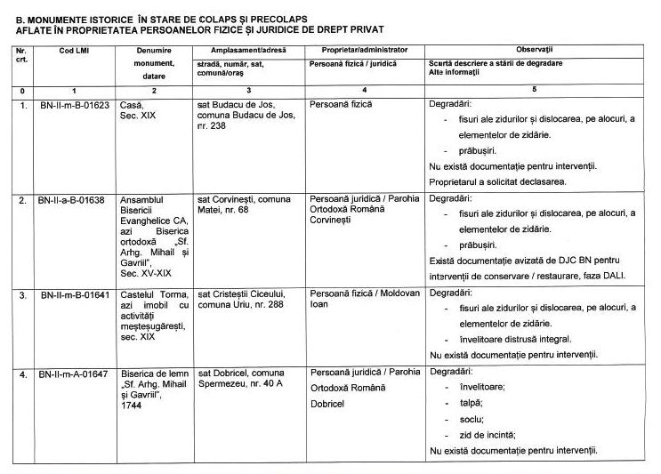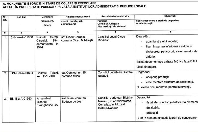"Potrivit răspunsului primit de biroul nostru parlamentar de la Direcția Județeană pentru Cultură Bistrița-Năsăud, la solicitarea pe care am adresat-o privind situația clădirilor de patrimoniu din județ, pe lista clădirilor aflate în stare avansată de degradare se află nu mai puțin de 17 monumente istorice, în stare de colaps și precolaps.