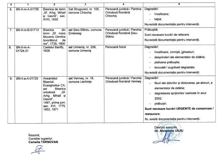 De asemenea alte nouă clădiri de patrimoniu din județ, aflate în aceeași stare de colaps și precolaps, sunt în proprietatea unor persoane fizice și juridice de drept privat: Ansamblul Bisericii Evanghelice din Corvinești, Castelul Torma din Cristeștii Ciceului, Casă din sec. al XIX lea în comuna Budacul de Jos, Bisericile din lemn cu hramul Sfinții Arhangheli Mihail și Gavril din satul Dobricel, respectiv din Strugureni, Biserica din lemn cu hramul Sf. Dimitrie din Șieu – Sfântu, Castelul Banffy din Urmeniș și Ansamblul Bisericii Evanghelice din Vermeș comuna Lechința", precizează Cristina Iurișniți.