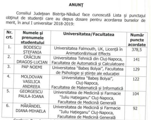 În acest an, pentru acordarea celor două burse de merit studenţilor din anul I, la Consiliul Judeţean Bistriţa-Năsăud s-au depus 6 dosare, studenții cu cel mai mare punctaj urmând să obțină aceste burse.Ștefania Bodescu, studentă la o universitate din Marea Britanie și Dragoș - Lucian Crăciun, student la Universitatea Tehnică din Cluj - Napoca, sunt studenții care au obținut cele mai bune punctaje, asta după ce o comisie special constituită în acest sens a întocmit un clasament. Dacă nu vor fi depuse contestații, cei doi au mari șanse să devină beneficiarii burselor de merit acordate de Consiliul Județean Bistrița-Năsăud.