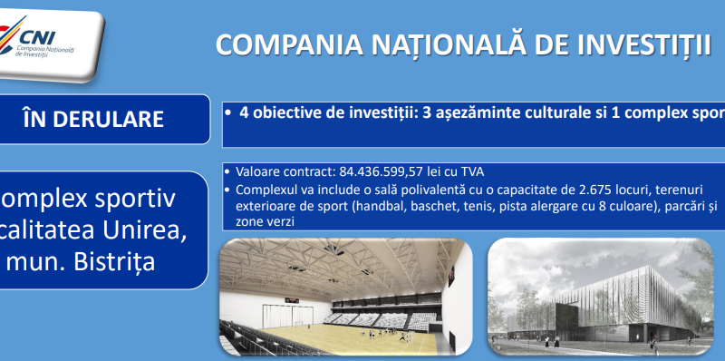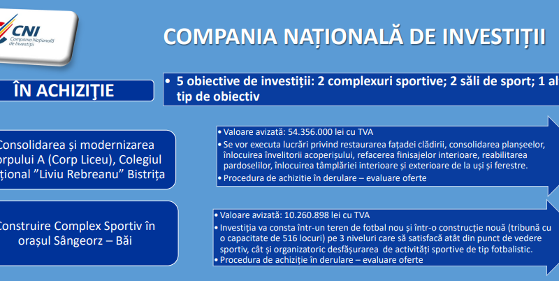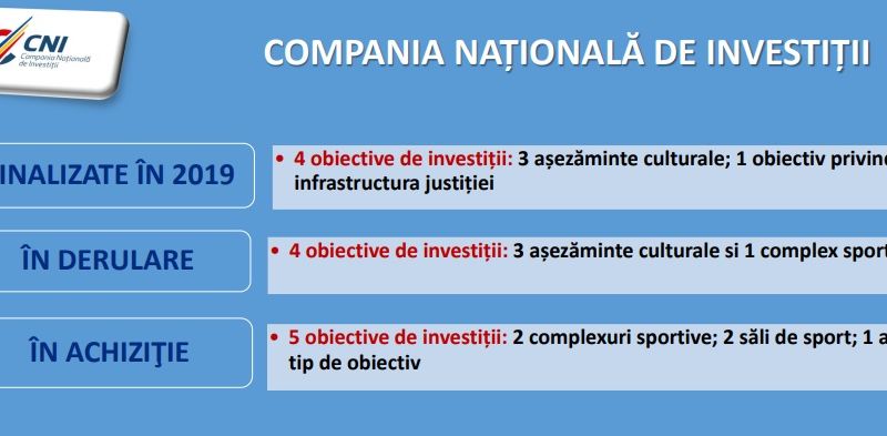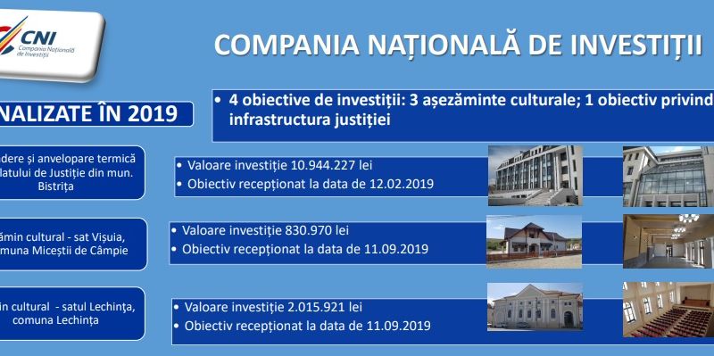 În ceea ce privește investițiile derulate prin intermediul Companiei Naționale de Investiții, la nivel județean este vprba despre 4 obiective finalizate în cursul anului 2019 și alte 9 în stadiu fie de derulare, fie de achiziție publică.