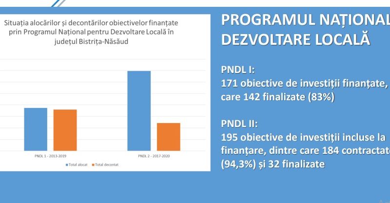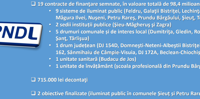 ”Mult hulitul PNDL, care acum este susținut, lăudat și continuat de către actualii guvernanți, înseamnă pentru județul Bistrița-Năsăud 162 de drumuri comunale, județene, străzi, zone pietonale și poduri, 105 școli, grădinițe și creșe, 16 unități sanitare, 18 sisteme de iluminat public, 51 de sisteme de alimentare cu apă și canalizare și 14 alte obiective. În total, sunt proiect în valoare de peste un miliard de lei, iar în cursul anului 2019, în decursul mandatului meu am promovat 19 obiective noi, în valoare de circa 100 de milioane de lei, printre beneficiari aflându-se și comunități conduse de primari PNL. Mă refer la Feldru, Nușeni, Șieuț, Chiochiș și la Șieu Măgheruș