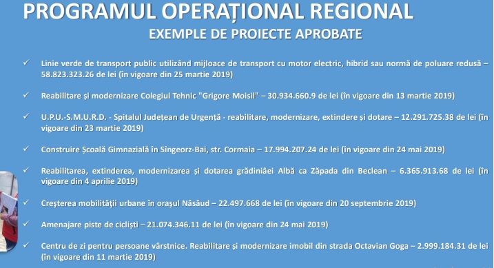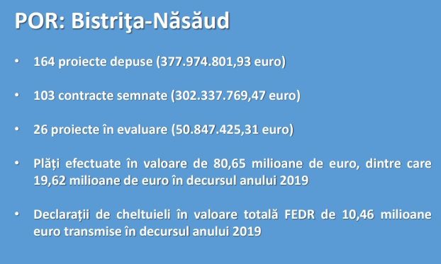 De asemenea, pe fonduri europene, pe Programul Operațional Regional, fostul ministrul spune că s-a reușit în cele 8 luni semnarea a 103 contracte de finanțare pentru județul Bistrița-Năsăud, cu o valoare de peste 300 de milioane de euro.