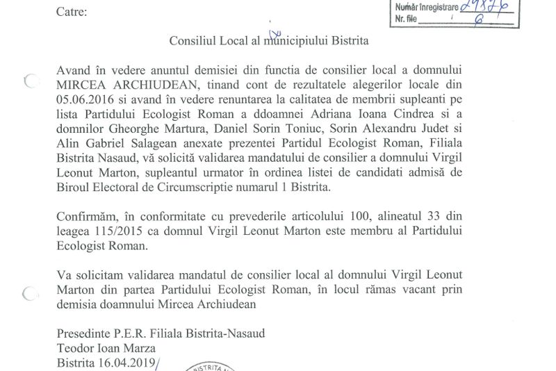 După ce Mircea Archiudean și-a dat demisia din funcția de consilier municipal, Partidul Ecologist Român filiala Bistrița-Năsăud a înaintat o adresă către Consiliul Local Bistrița prin care solicită ca locul rămas vacant să fie ocupat tot de un ecologist.