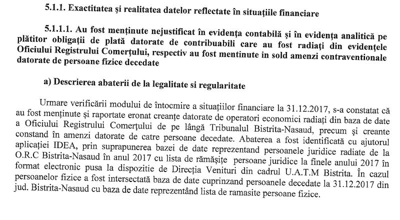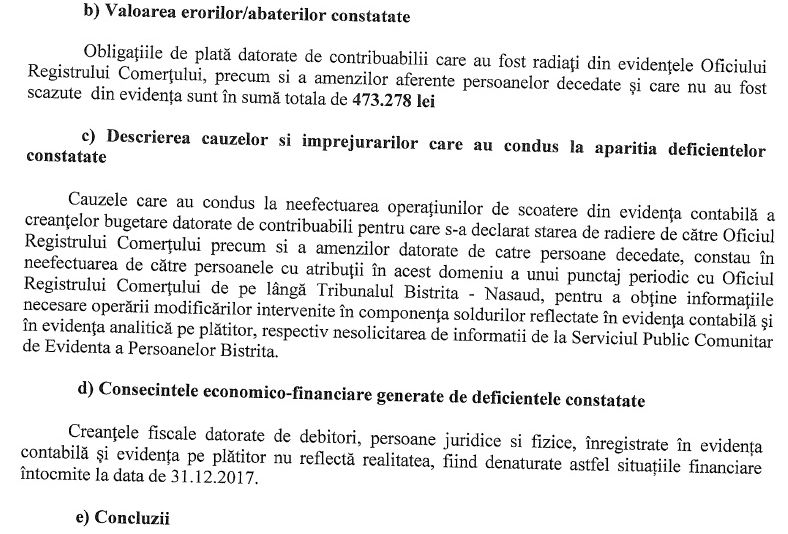 Curtea de Conturi Bistrița-Năsăud a întocmit un raport de audit financiar în care au fost exemplificate o serie de nereguli depistate în timpul unui control efectuat la Primăria Bistrița. Printre deficiențe se numără și una care ar fi denaturat bugetul municipiului cu circa jumătate de milion de lei.