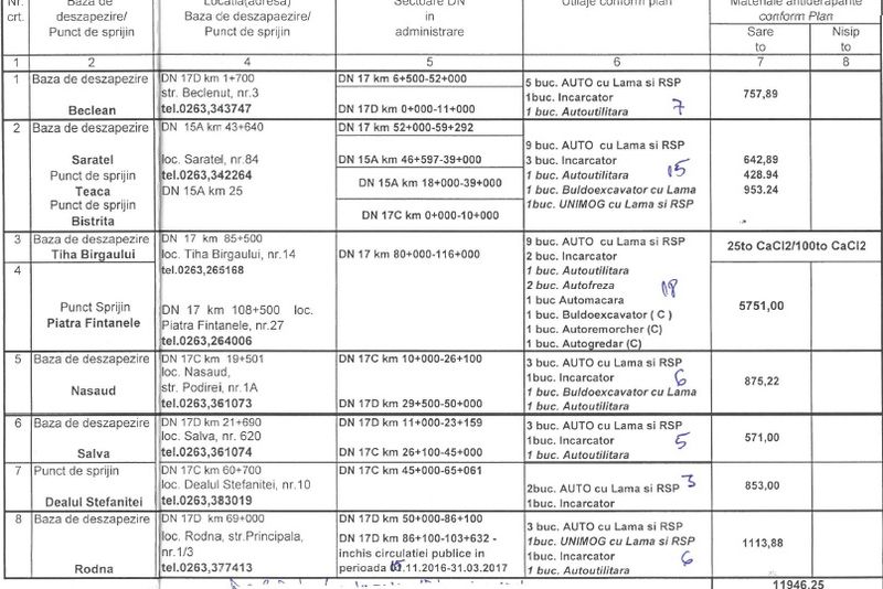 Într-o ședință a Colegiului Prefectural, prefectul Ovidiu Frenț, a prezentat situația din cele 6 baze de deszăpezire și 4 puncte de sprijin din județ, de unde se va acționa pe drumurile naționale care tranzitează județul. Iată cum arată stocurile: