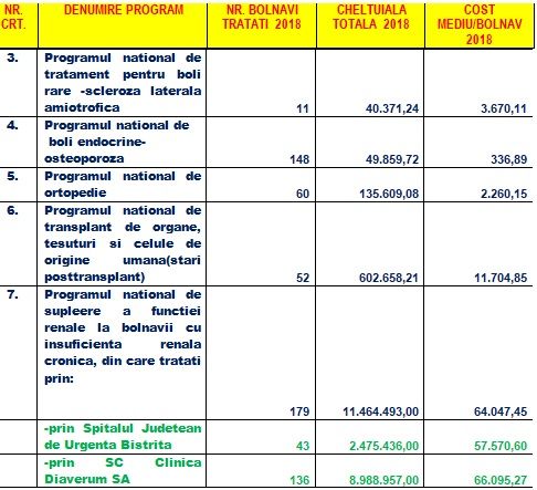 Totodată, în ceea ce privește alte programe naționale de sănătate, CJAS Bistrița-Năsăud a mai decontat cheltuieli pentru pacienți cu boli rare (11 pacienți), boli endocrine - osteoporoză (148 pacienți), de natură ortopedică precum operații de șold (60 pacienți). De asemenea, la nivelul județului Bistrița-Năsăud s-au decontat și tratamentele post-operatorii pentru 52 de pacienți care au beneficiat de transplant de organe, țesuturi și celule de origine umană și pentru 179 de pacienți cu insufiență renală cronică.