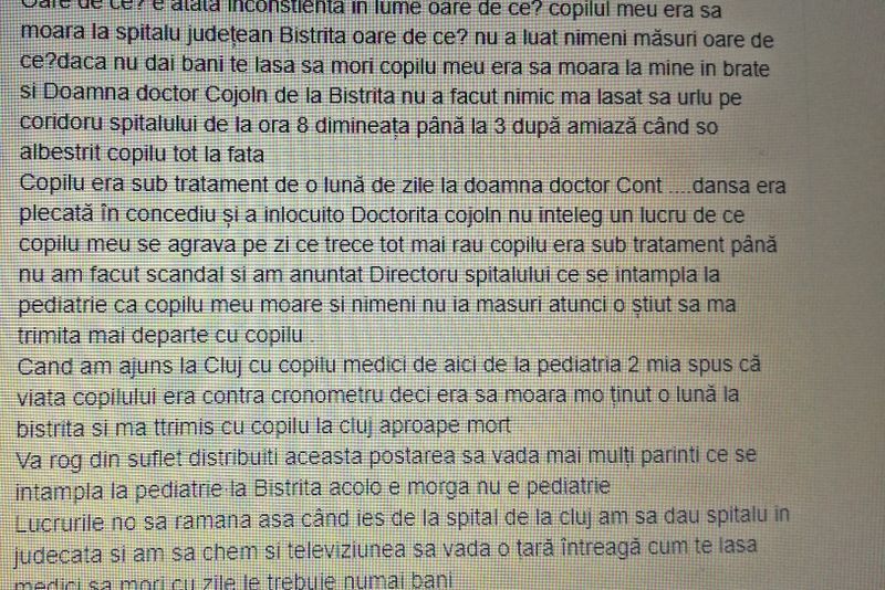 „Oare de ce e atâta inconștiență în lume, oare de ce? Copilul meu era să moară la Spitalu Județean Bistrița, oare de ce? Nu a luat nimeni măsuri, oare de ce? Dacă nu dai bani te lasă să mori, copilul meu era sa moară la mine în brațe si Doamna doctor Cojoln de la Bistrița nu a făcut nimic, m-a lăsat să urlu pe coridoru spitalului de la ora 8 dimineața până la 3 după amiază când s-o albestrit copilu tot la față.