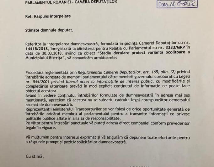În luna martie a acestui an, deputatul Ionuț Simionca a adresat o interpelare ministrului Transporturilor cu privire la alegerea făcută în legătură cu centura ocolitoare a municipiului Bistrița, în condițiile în care, de mai de 10 ani, varianta sudică este contestată și blocată. Mai mult decât atât, acest traseu pătrunde pe o porțiune prin intravilanul municipiului. În urmă cu 10 ani însă, proiectantul IPTANA a întocmit o documentație alternativă care viza un traseu și pe la nord de municipiul Bistrița. Cu toate acestea, municipalitatea a insistat pentru varianta sudică.Pe lângă argumentele solicitate, deputatul Simionca a cerut ministrului să îi comunice totodată, în copie, și notele de fundamentare emise de IPTANA pentru ambele variante de traseu și avizul motivat al CNADNR prin care s-a avizat varianta sudică a traseului de ocolire a municipiului Bistrița.După mai bine de 7 luni, a venit și răspunsul ministrului Lucian Șova, care practic îi transmite deputatului de Bistrița-Năsăud că informațiile solicitate nu sunt publice.