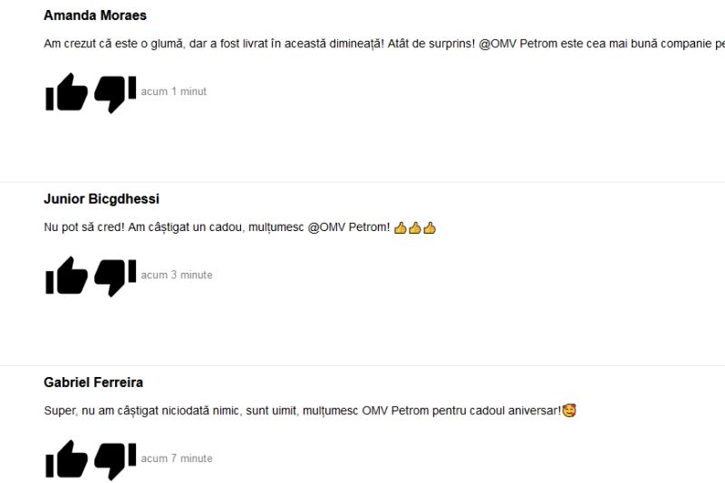 În partea de jos a chestionarului sunt și așa-zise feedback-uri, lăsate de la oamenii care au completat chestionarul, iar toate sunt numai de bine: „Nu pot să cred! Am câștigat un cadou, mulțumesc OMV Petrom!”, și multe altele.