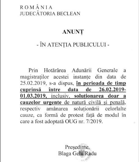 Judecătoria Beclean a anunțat pe portatul secțiunea dedicată pe portalul instanțelor de judecată faptul că magistrații acestei instanțe au decis ca, în perioada 26.02.2019 - 1.03.2019 să soluționeze doar cauzele urgente de natură penală sau civilă, celelalte cauze fiind amânate. Decizia luată de judecătorii de la Beclean este modul lor de protest față de modul în care a fost adoptată OUG 7/2019.