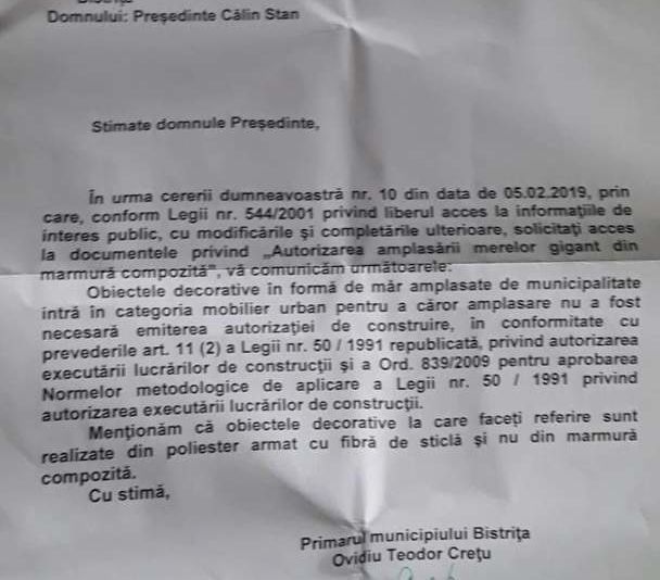 De menționat este faptul că reprezentanții Uniunii Salvați România Bistrița au depus, în urmă cu câteva săptămâni, o solicitare către Primăria Bistrița prin care cereau explicații cu privire la legalitatea amplasării merelor în oraș, așa cum Realitatea de Bistrița a prezentat AICI.Reprezentanții USR Bistrița au vrut să știe dacă administrația locală a respectat toți pașii legali și dacă a obținut toate avizele și autorizațiile necesare pentru a putea amplasa în diverse zone din oraș mere gigant din fibră de sticlă.În legătură că acest aspect, Primăria Bistrița a oferit un răspuns către USR Bistrița chiar luni, în ziua în care merele au fost mutate, explicând că nu a fost necesară emiterea unei autorizații pentru amplasarea merelor, ele făcând parte din categoria ”mobilier urban”.