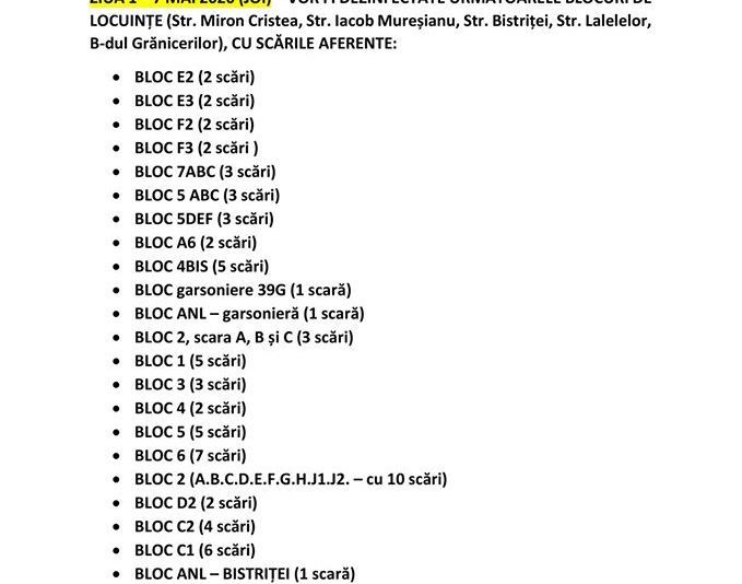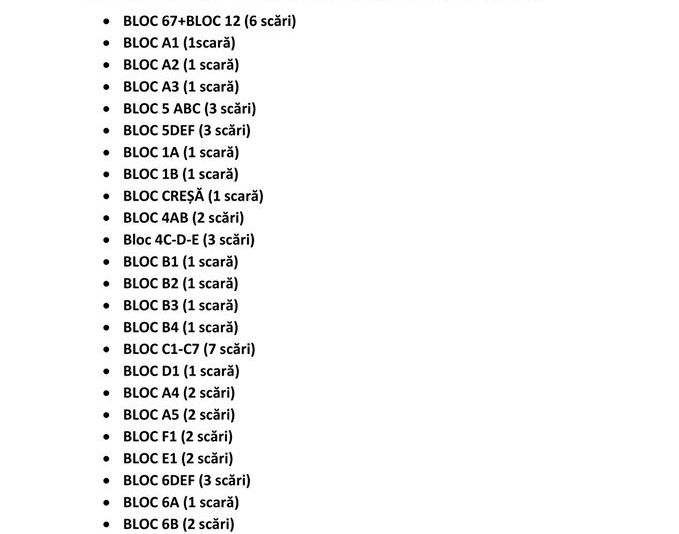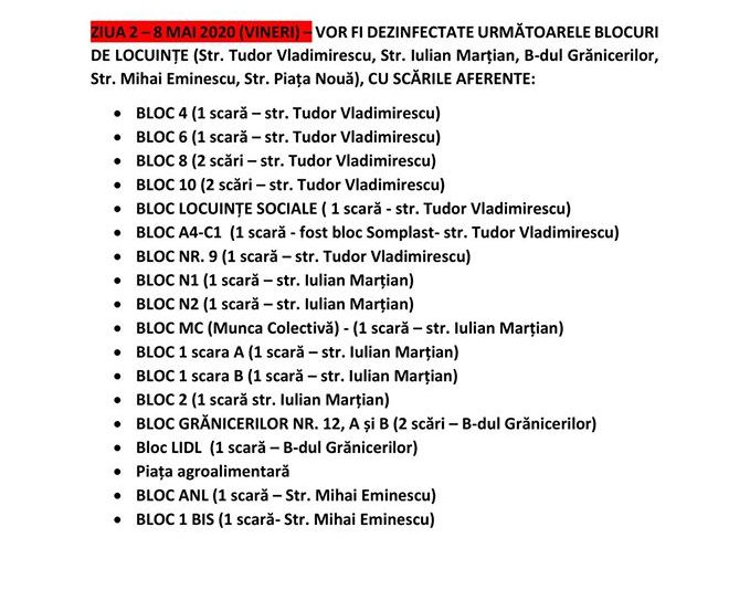 Îi rugăm pe locatarii cartierului de blocuri să nu iasă din locuințe, cel puțin 2 ore după administrarea dezinfectantului. De asemenea, solicităm asociațiilor de proprietari/locatarilor, să curețe balustradele și mânerul clanțelor de la uși, după cele 2 ore de la dezinfecție.
