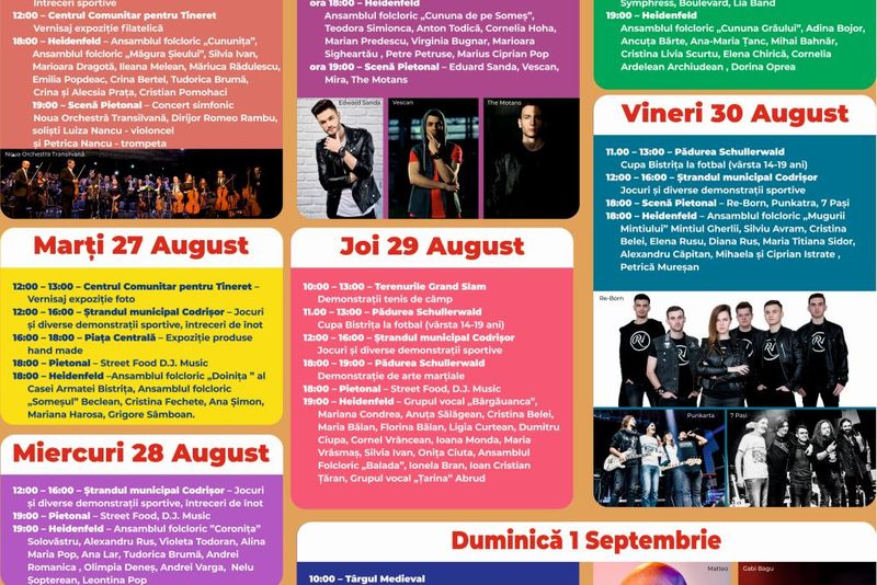 Astfel, în ceea ce privește ediția din acest an a Târgului Mare al Bistriței, deschiderea festivă va avea loc sâmbătă, 24 august, în sala de şedinţe a Primăriei Bistriţa, de la ora 10, programul cuprinzând activități pentru toate vârstele și toate gusturile. Programul poate fi consultat mai jos: