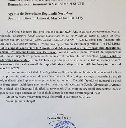 am trimis o solicitare în scris domnului ministru Daniel Suciu (care trebuie să semneze contractul), să aibă în vedere faptul că această școală nu mai poate intra în următorul an școlar datorită stării avansate de degradare și să urgenteze semnarea acestuia.