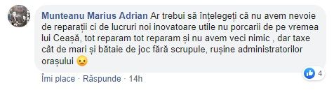 Ar trebui să înțelegeți că nu avem nevoie de reparații ci de lucruri noi, inovatoare, utile nu porcării de pe vremea lui Ceașă, tot reparăm, tot reparăm și nu avem veci nimic, dar taxe cât de mari și bătaie de joc fără scrupule, rușine administratorilor orașului”,