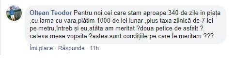 ”Pentru noi, cei care stăm aproape 340 de zile în piață, cu iarnă cu vară, plătim 1.000 de lei lunar, plus taxa zilnică de 7 lei pe metru, întreb și eu, atâta am meritat? Doua petice de asfalt? Câteva mese vopsite? Astea sunt condițiile pe care le merităm?