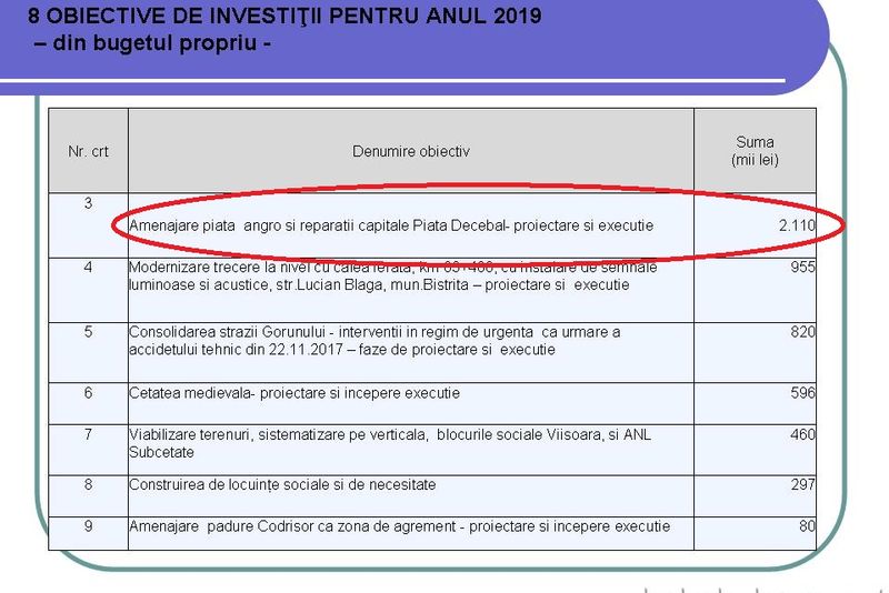 Din bugetul local al municipiului Bistrița pe anul 2019, suma de 2,1 milioane de lei a fost prevăzută pentru Amenajare piața angro și reparații capitale Piața Decebal - proiectare și execuție.