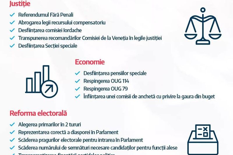 , USR va susține schimbarea legislației pentru alegerea primarilor în două tururi de scrutin, reprezentarea corectă a diasporei în Parlament, scăderea pragurilor electorale pentru intrarea în Parlament, scăderea numărului de semnături necesare candidaților pentru funcții alese, transparentizarea finanțării partidelor politice.