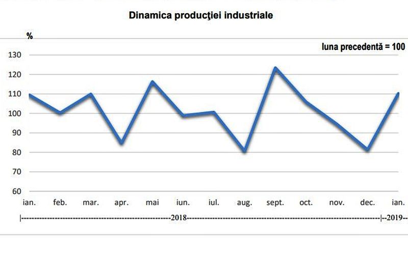 Totuși anumite sectoare au înregistrat și creșteri. Astfel, comparativ cu luna anterioară - decembrie 2018 - s-au înregistrat creșteri ale producției industriale la fabricarea produselor textile (78,6%), fabricarea echipamentelor electrice (24,0%), prelucrarea lemnului, fabricarea produselor din lemn şi plută, cu excepţia mobilei (11,4%) și fabricarea pieselor pentru autovehicule de transport rutier (8,1%). Scăderi faţă de luna anterioară au înregistrat activitățile: fabricarea de mașini, utilaje și echipamente n.c.a. (-18,2%), industria metalurgică (-16,6%), fabricarea produselor din cauciuc și mase plastice (-11,8%) și industria alimentară (-4,9%).