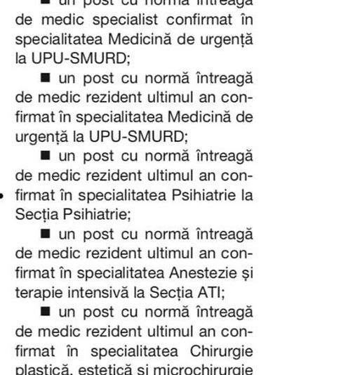 Potrivit managerului spitalului, Gabriel Lazany, au fost scoase la concurs șase posturi de medici, după cum urmează: