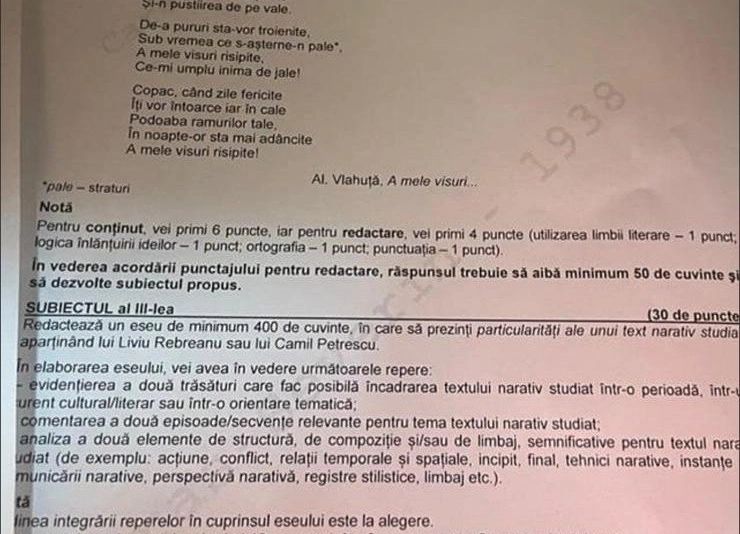 În ceea ce privește Subiectul I, comun la ambele profiluri, elevii au avut textul „Viața și opera lui G. Călinescu”, un fragment din volumul lui Ion Creangă, iar la punctul B au avut de argumentat dacă oamenii trebuie sau nu să exprime recunoștință față de școlile în care au fost formați.