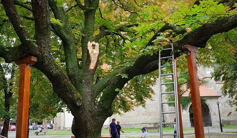 Un castan vechi de peste 100 de ani, situat în Centrul Istoric al municipiului Bistrița a fost salvat de autoritățile locale, care au montat proptele pentru a spijini bătrânul copac.