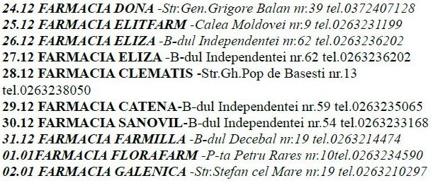Pentru perioada sărbătorilor de iarnă, asistenţa medicală va fi asigurată de către serviciile de urgenţă prespitaliceşti şi spitaliceşti.