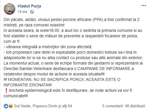 Primarul comunei Tîrlișua, Vlăduț Purja, atrage atenția localnicilor din această zonă că, deși au fost confirmate două cazuri de pestă porcină africană la porci mistreți, momentan nu se impune sacrificarea porcilor din gospodăriile populației, până în prezent nefiind înregistrat niciun caz la animalele domestice. Potrivit unui mesaj al primarului, ancheta epidemiologică este în plină desfășurare și până când aceasta va fi finalizată, cei care dețin porci trebuie să țină cont de câteva măsuri de siguranță.