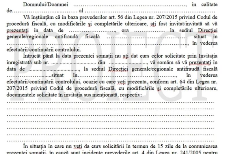Un proiect de ordin pus în dezbatere publică arată că Direcția Antifraudă Fiscală, instituție subordonată ANAF, va trimite contribuabililor „invitații” prin care li se va cere să arate documentele necesare verificărilor. Neprezentarea se va considera infracțiune și va fi pedepsită cu închisoarea.