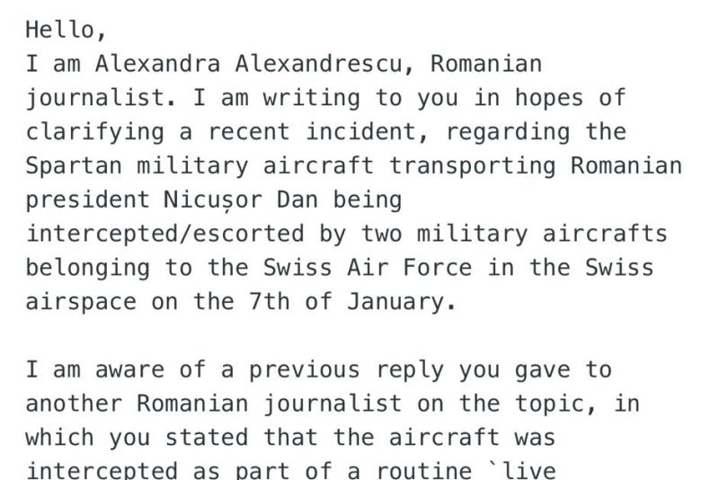 Bună ziua, Sunt Alexandra Alexandrescu, jurnalistă din România. Vă scriu în speranța de a clarifica un incident recent, referitor la aeronava militară Spartan care îl transporta pe președintele României, Nicușor Dan, și care a fost interceptată/escortată de două aeronave militare aparținând Forțelor Aeriene Elvețiene, în spațiul aerian elvețian, pe 7 ianuarie.